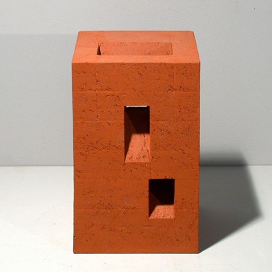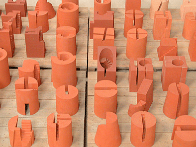 Inzwischen weiß ich, dass der Gedanke trägt. Seit Januar entstehen nun in der Nachfolge der Mattoni und der Kunda konzentrierte blockhafte Arbeiten in ähnlichem Maßstab (15 bis 30 cm Höhe). Zwischen Skulptur und architektonischem Bruchstück haben sich um das Thema "Treppenfragment" verschiedene Reihen entwickelt, jeweils als Variationen dieses Gedankens. Durch Teilen des Blocks, durch Auflösen und Durchbrechen des Volumens, durch erneutes Zusammenfügen und Zusammenfassen entwickelt sich ein Feld miteinander verwandter dreidimensionaler Arbeiten. Allen gemeinsam ist das diagonale oder spiralige Erschließen und Gliedern eines einfachen, blockhaften Volumens durch Rampen und Treppen.