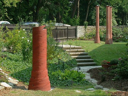 im Hintergrund drei schlanke Säulen, im Garten der Galerie Hennemann Bad Homburg